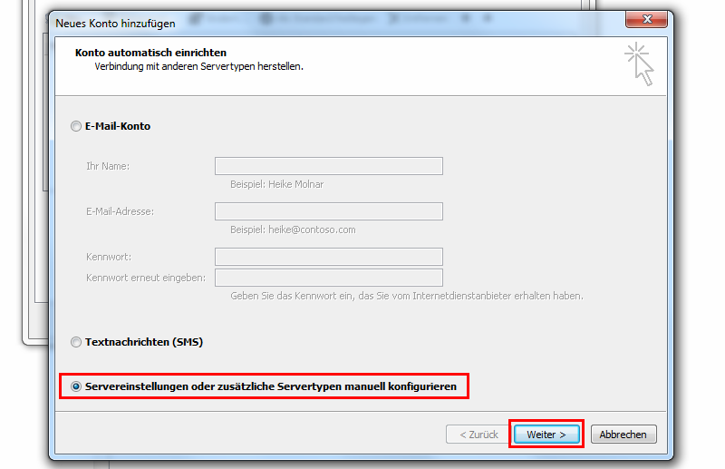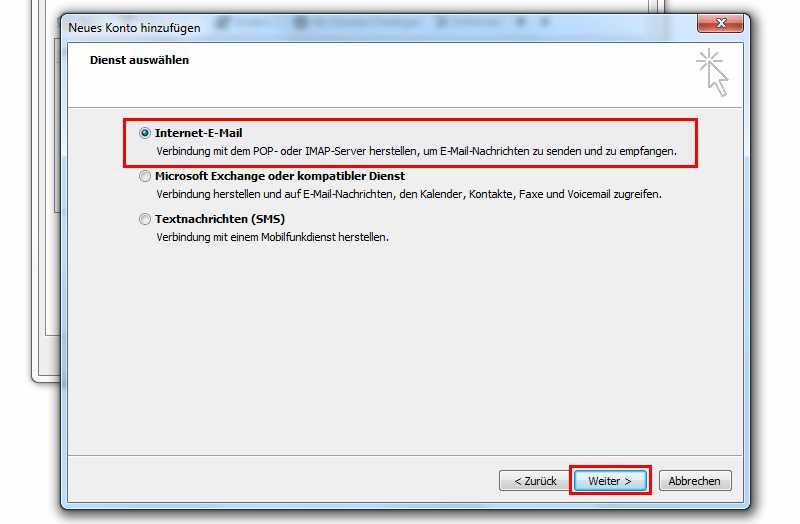 Wählen sie als Art der Verbindung Internet-E-Mail aus