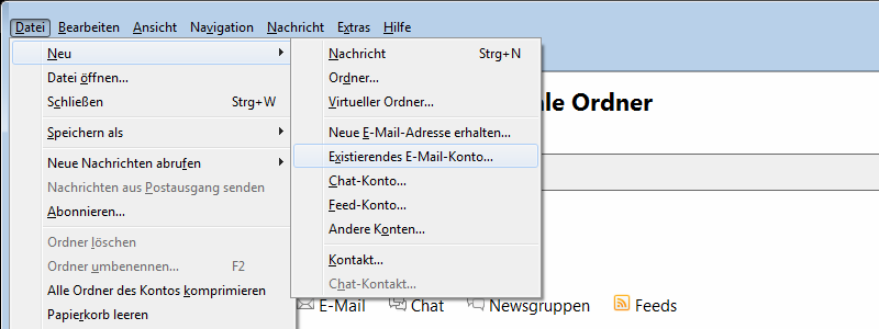 Beginnen sie mit der Einrichtung über Datei > Neu > Existierenedes E-Mail-Konto…